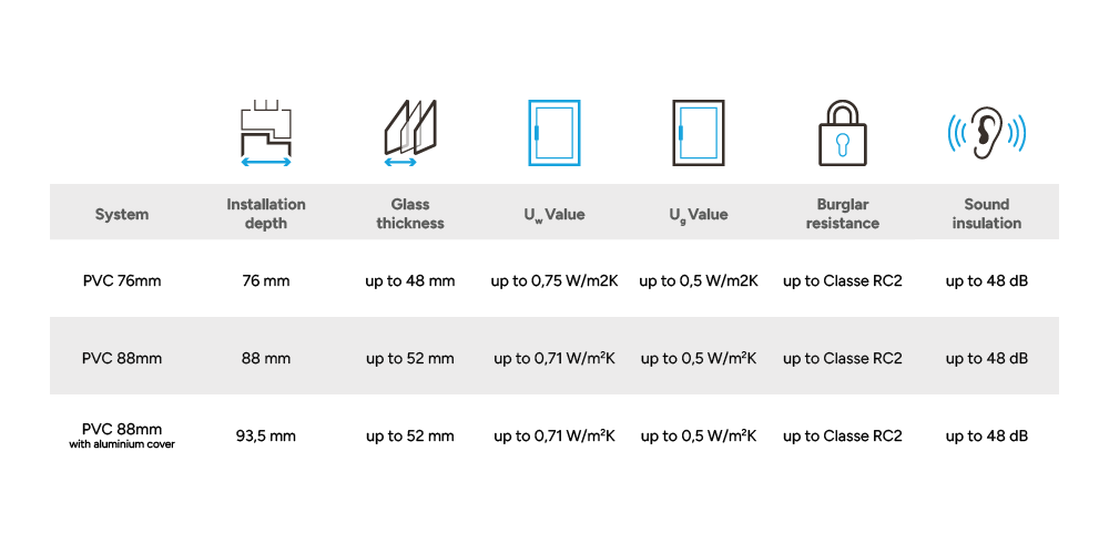 - 76mm PVC profile (optionally double or triple glazing)