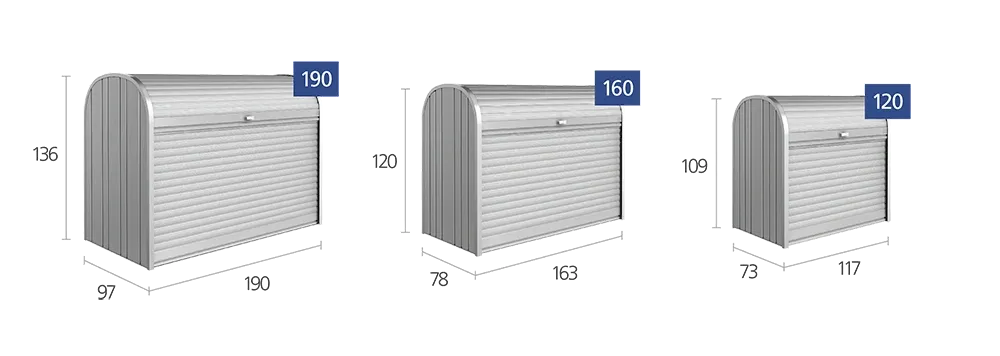 Les boîtes sont étanches à l’eau de pluie, de sorte que vélos, mobylettes, tondeuses à gazon et autres appareils restent au sec et protégés pendant l’hiver. Une serrure à cylindre protège également le contenu contre tout accès non autorisé.