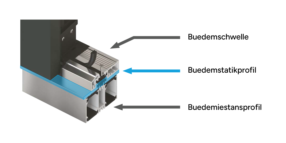 D'Buedemstatikprofil mat der Positionéierungsnut an dem Ofdichtungsband ass serieméisseg. Ënnen mat engem optimale Querschnitt garantéiert et eng absolut formstabil Konstruktioun vun hirer Dier, déi ganz wichteg fir den Transport an eng séier an genee Montéierung ass.