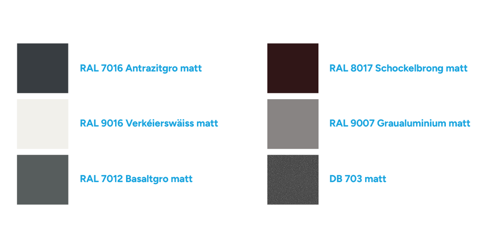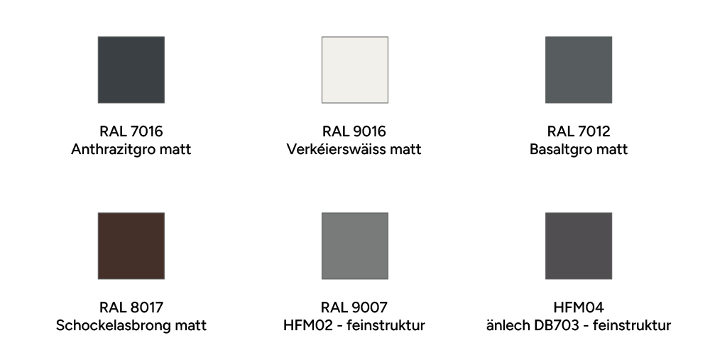 Eng detailléiert Iwwersiicht iwwer RAL-Faarwen fënns du hei: