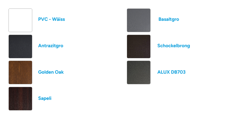 D'Faarf vun der Dier prägt den Androck vun dengem Haus. Dank enger Villfalt vu verfügbare Faarwen kanns du deng Dier perfekt un d'Fassade an d'Fënsteren upassen oder Akzenter setzen.