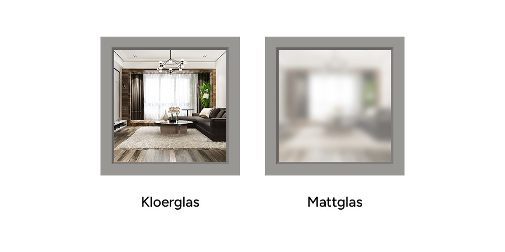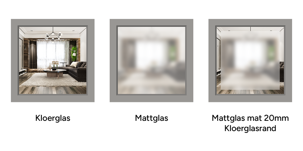 Du kanns bei den Inotherm-Diermodeller tëschent Klarglas, Mattglas a Mattglas mat 20mm Klarglasrand auswielen.