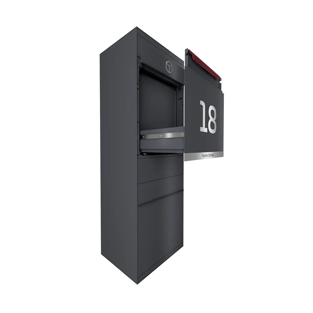 D’Sécherheetskonzept ass duerchduecht: D’Päck kommen an eng Schubla, déi blockéiert soubal d’Box voll ass. Kee kann vun vir einfach Päck eraushuelen – deng Sendunge bleiwen och bei voller Box geschützt. Schlësselen a Schlässer si widderstands- a Wiederbestänneg ënnerbruecht. D’Réckwand aus massive Stolblech suergt fir extra Schutz géint Déifstall a Vandalisme. Päck an Bréiwer kanns de all Kéier komfortabel vun der Récksäit eraushuelen. Soubal alles eidel ass, kann d’Box firawerder direkt erëm gefëllt ginn – ganz ouni Suerge fir deng Post.