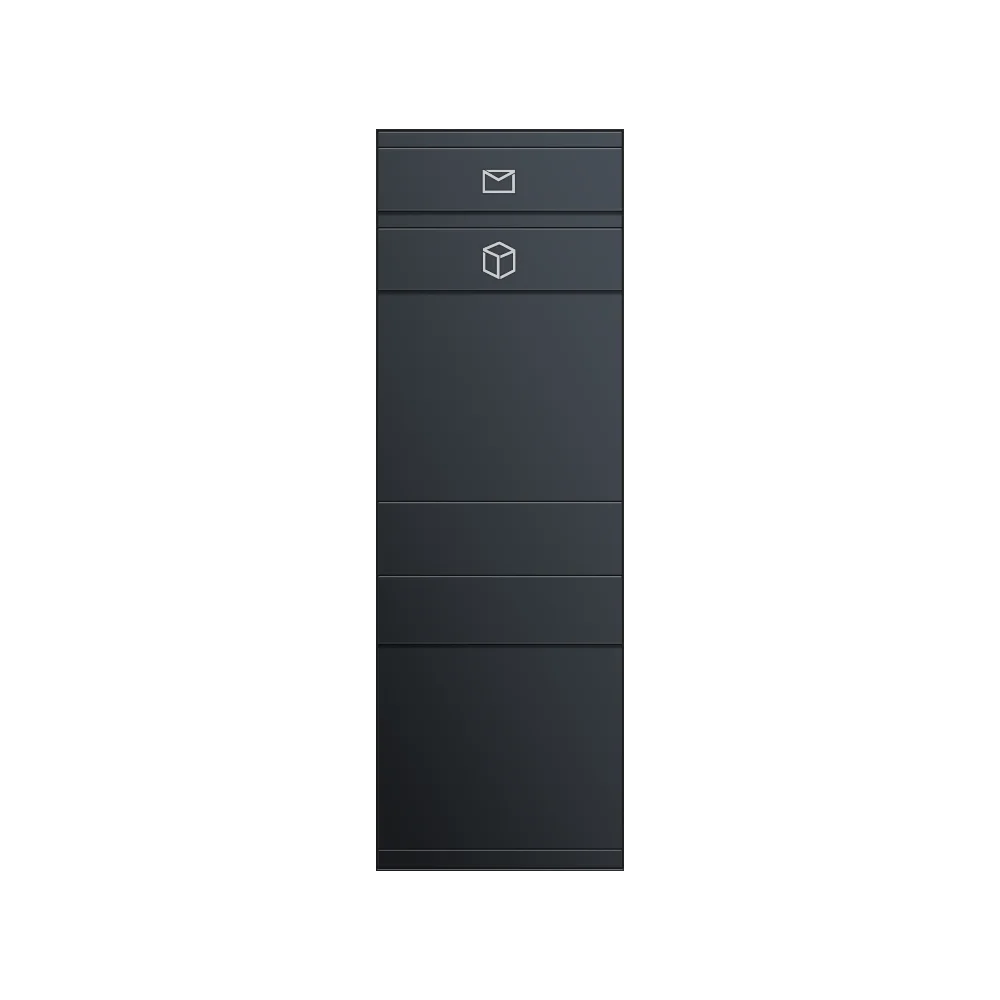 D'Design vun der Paketbox iwwerzeegt op der ganzer Linn. D'Uewerfläch vun der Box ass komplett nidd- a schrauwenfräi. Duerch déi wiederbestänneg Pulverbeschichtung an matter Feinstruktur ass d'Box optimal géint UV-Stralung an Wiederinflëss geschützt. Fir eng ugespaanten Optik och no laanger Notzung am Bausseberäich. Däitsch Qualitéit aus eegener Produktioun.