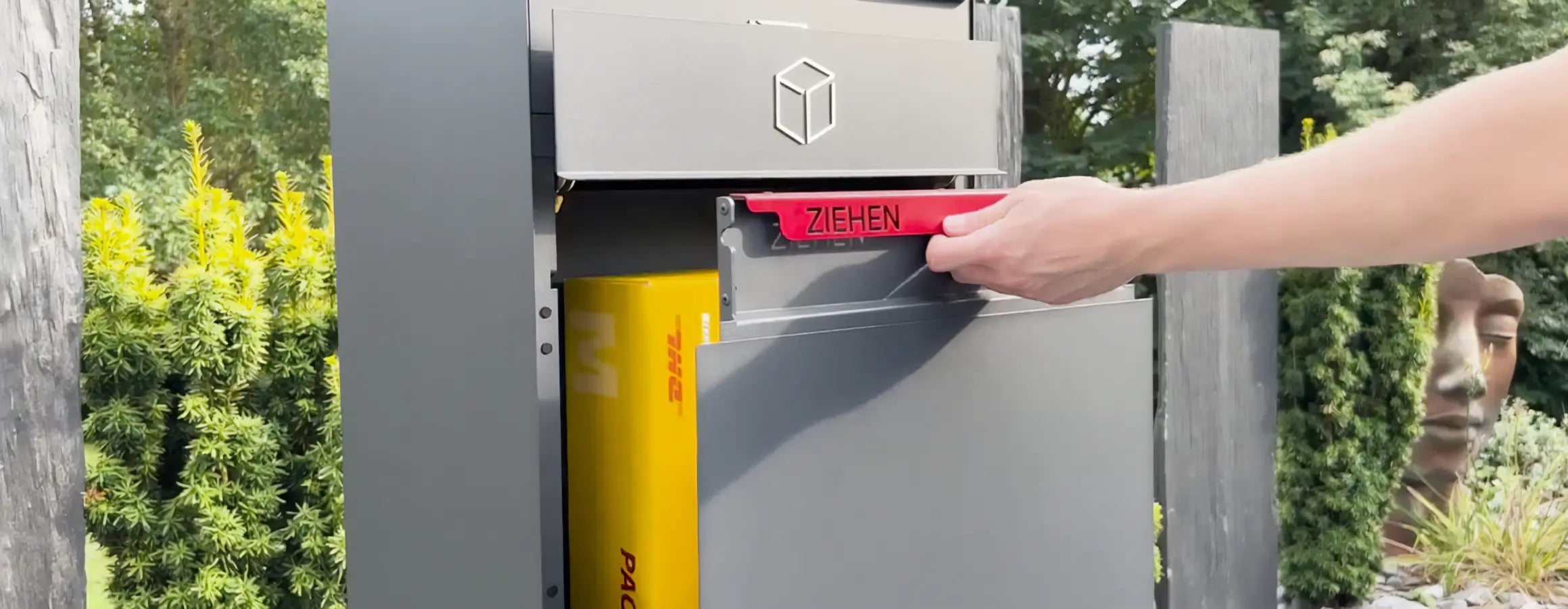2. Zoustellschubla fir de Paketen-Entrée duerch Zéien opmaachen. Beim Opzéien vun der Schubla schléissen sech automatesch déi integréiert
