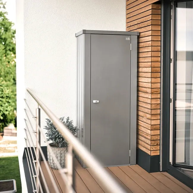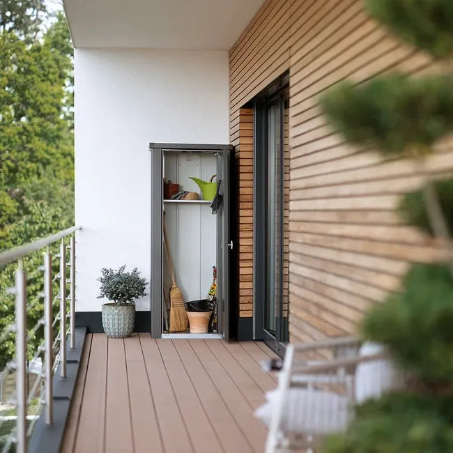 Zu Romeo® gehéiert och eng Julia® – eis Terrasseschief wuessen mat de Fuerderunge vun modernen Outdoorberäicher. Mat véier Gréissten an hirer Eenzeldier passt de Terrasseschaf Julia® sech un verschidde Platzverhältnisser un a schaaft strukturéiert Uerdnung um Balkon an op der Terrass. Wéi de Romeo® iwwerzeegt och d'Julia® mat enger 2-facher Verriegelung, Gasdruckfieder fir e sanft Zoumachen an Regalbrieder an der Grondausstattung.