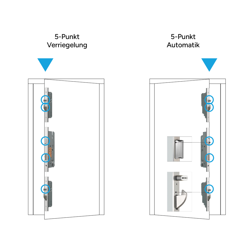 Sichere Türen sind für ein sicheres Zuhause unumgänglich. Deshalb verfügen alle unsere Türen bereits ab Werk über Schlösser mit einer 5-fach-Verriegelung mit massiven Zapfen, die einen sehr hohen Einbruchschutz bieten. Die Haustüren dieser Serie sind serienmäßig mit einer hochwertigen 5-fach-Verriegelung und durchgehenden einstellbaren Schließleiste aus massivem Edelstahl ausgestattet. Diese bietet erhöhte Sicherheit. Dornmass 45 mm.